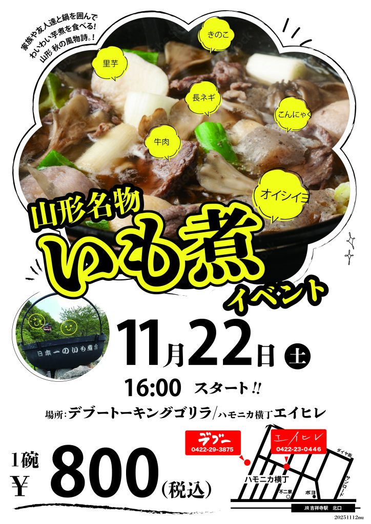 11月22日(土)16:00〜 山形料理「いも煮」なくなり次第終了 デブー/エイヒレ