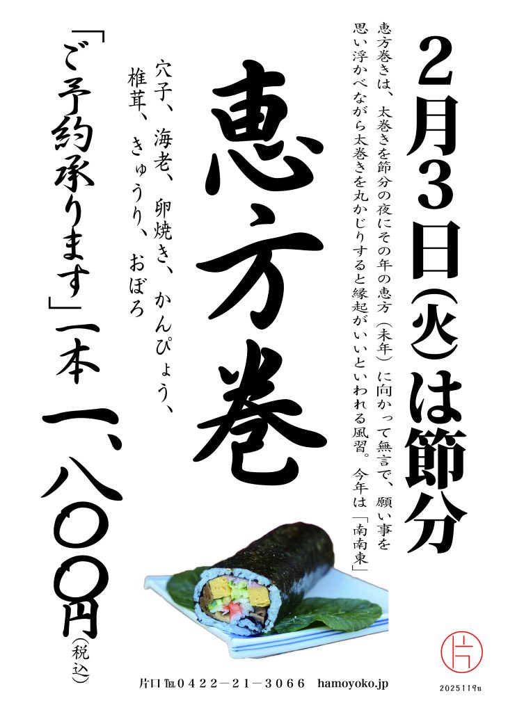 2/3(火)は節分 恵方巻!「ご予約承ります。」